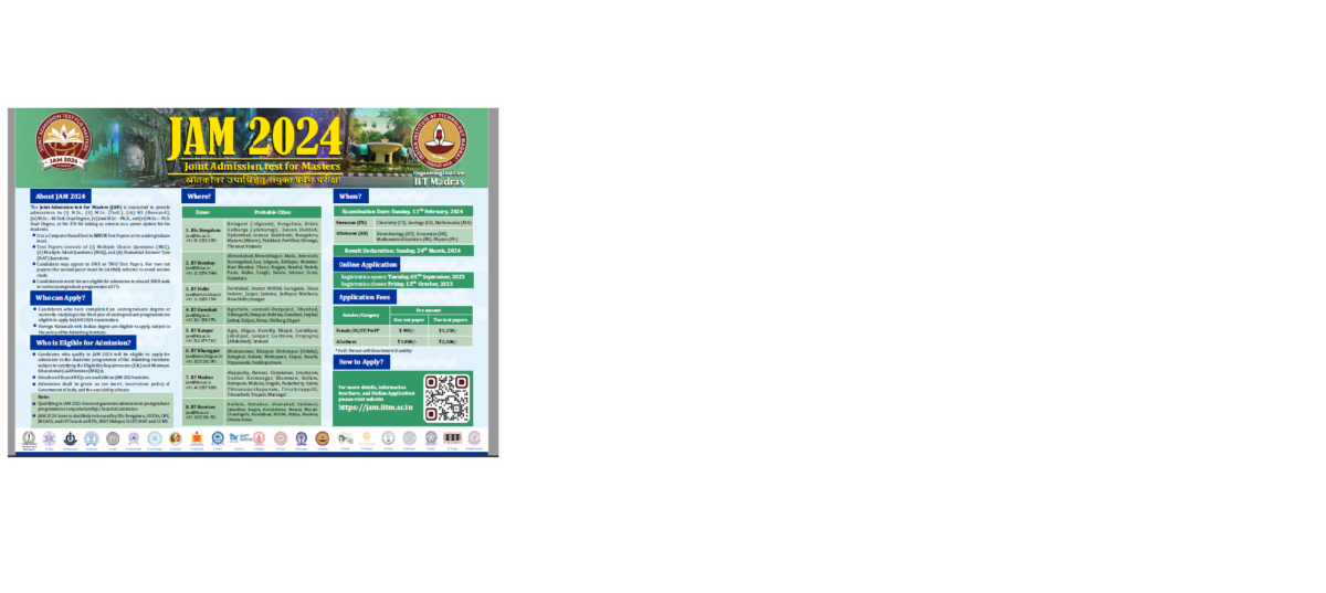 JAM 2024 will be a computer based test and will be conducted in seven test papers – Biotechnology, Chemistry, Economics, Geology, Mathematics, Mathematical Statistics, and Physics.